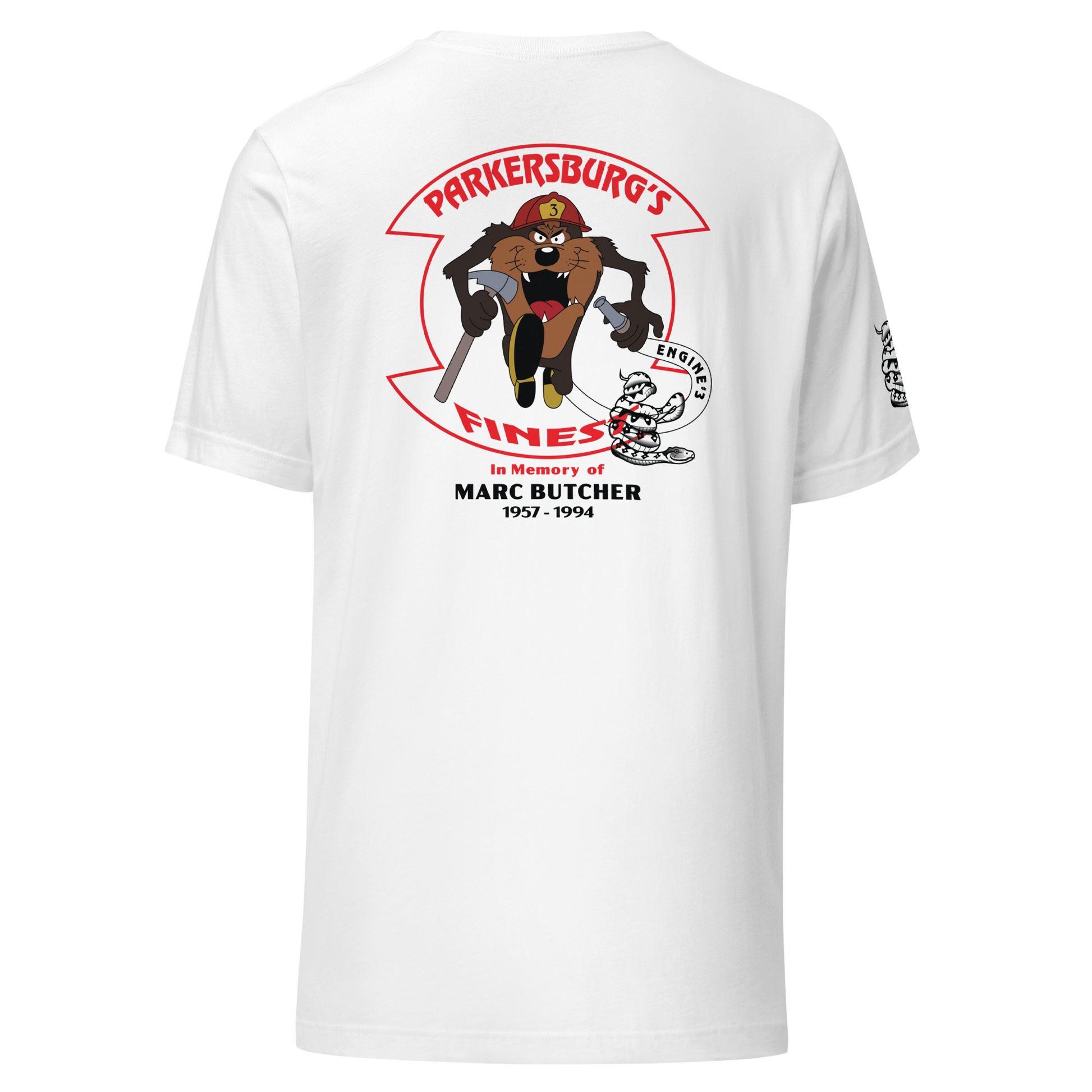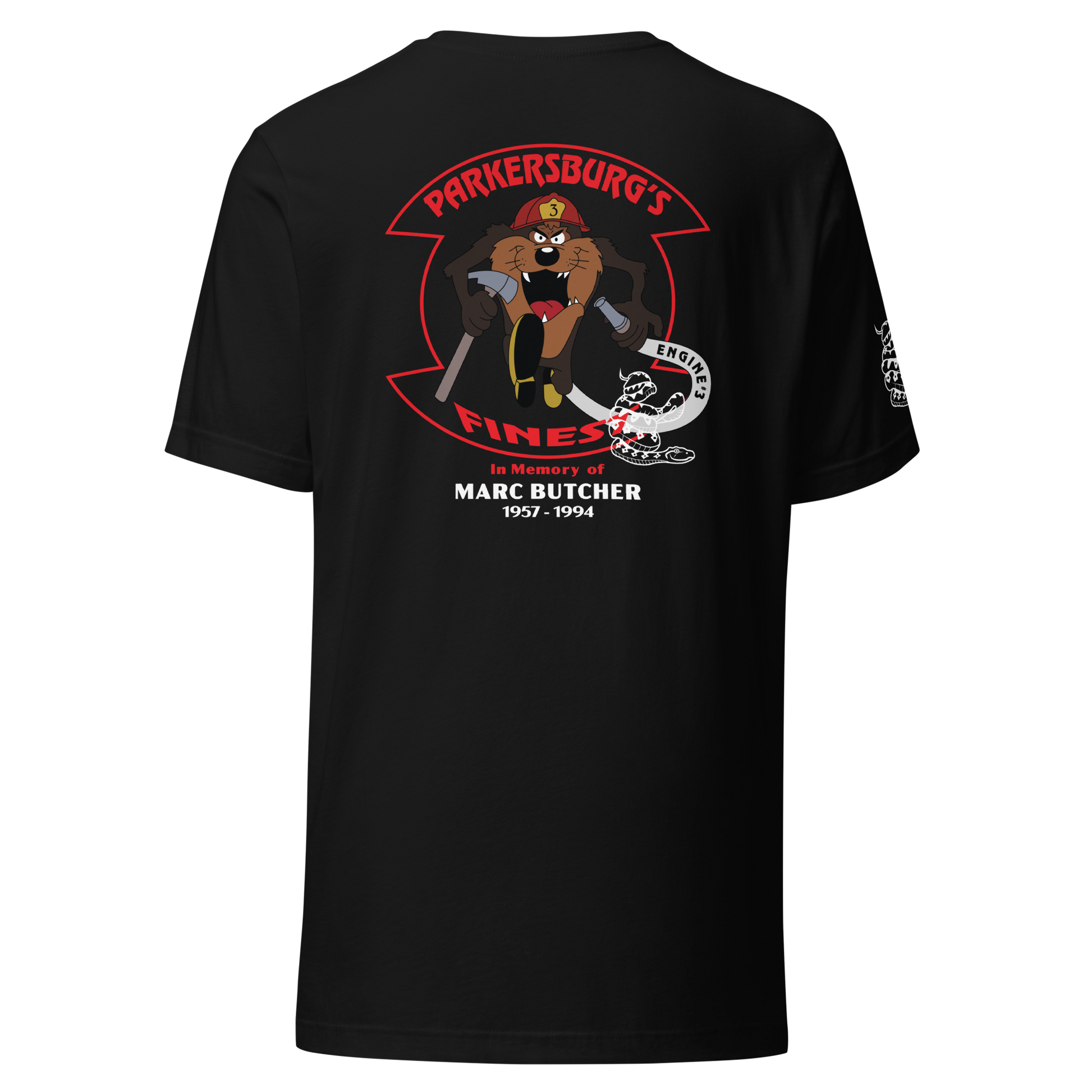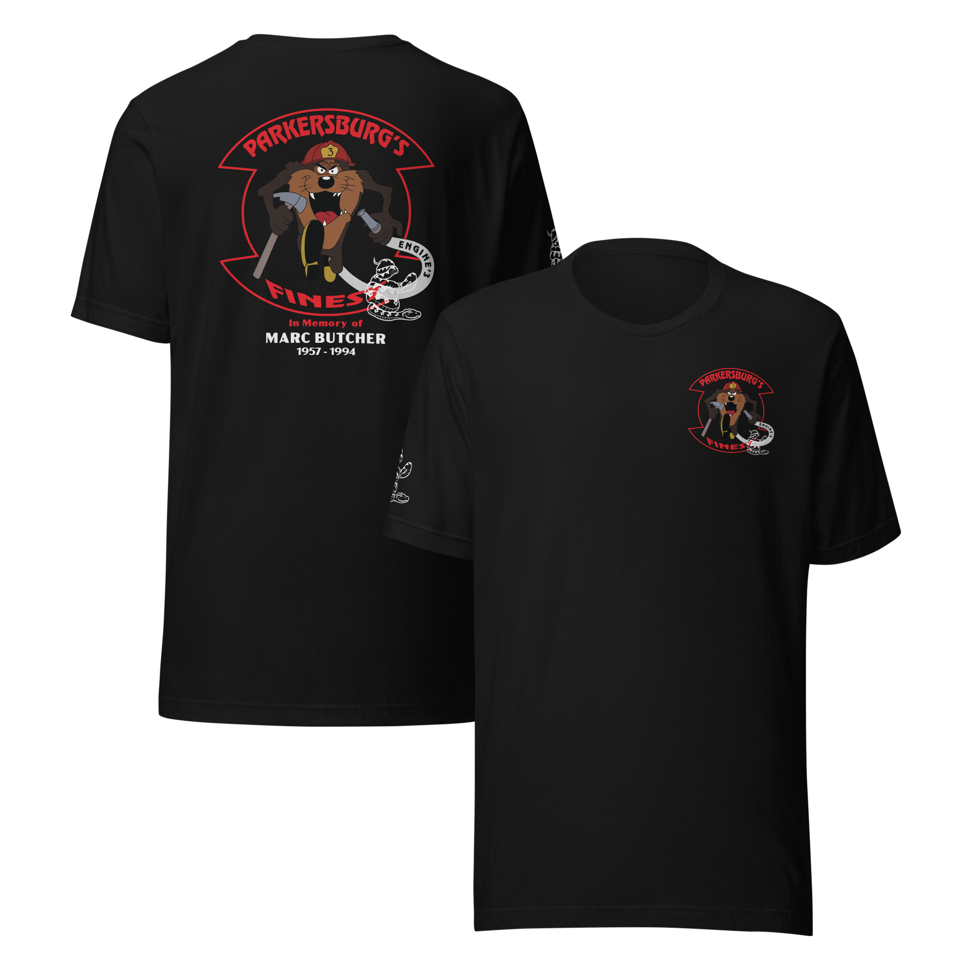 Marc’s legacy lives on not only through his dedication to the job, but also through moments that defined his character — including the time he rescued a large snake from a house fire, a story still remembered within the department to this day. This memorial tee brings that spirit of bravery and brotherhood back to life with the same artwork that once symbolized it.