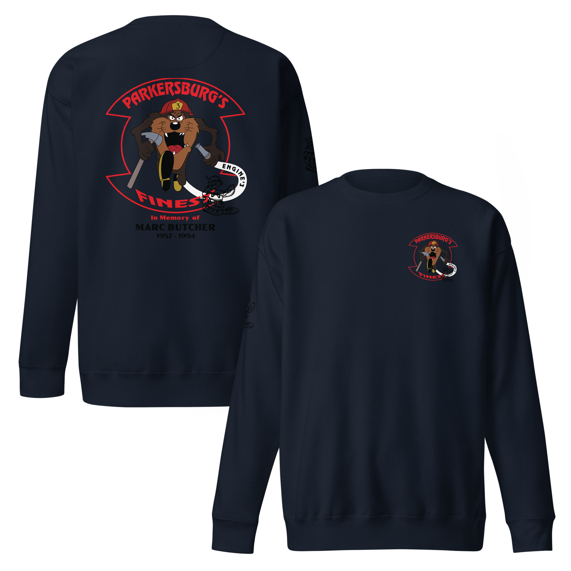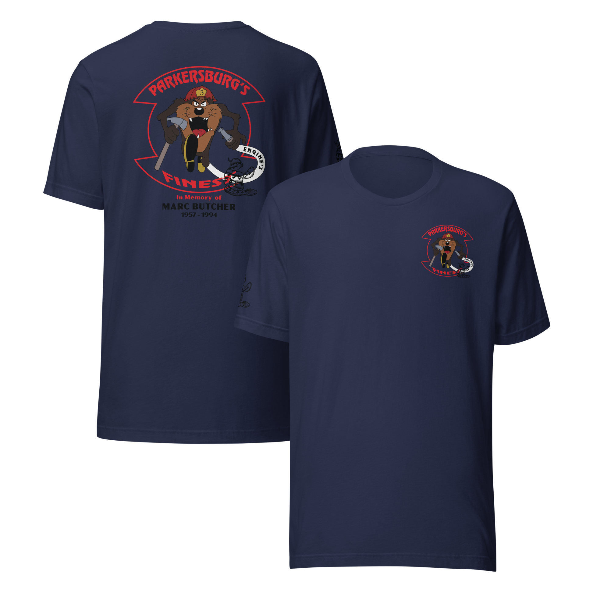 The Parkersburg’s Finest – Marc Butcher Memorial Tee honors the life, courage, and service of Firefighter Marc Butcher (1957–1994). The original design was created in his memory by his brothers at Engine 3, and this new edition has been faithfully remastered and vectorized by Frank’s WearHouse — preserving a piece of Parkersburg Fire Department history and the pride behind it.