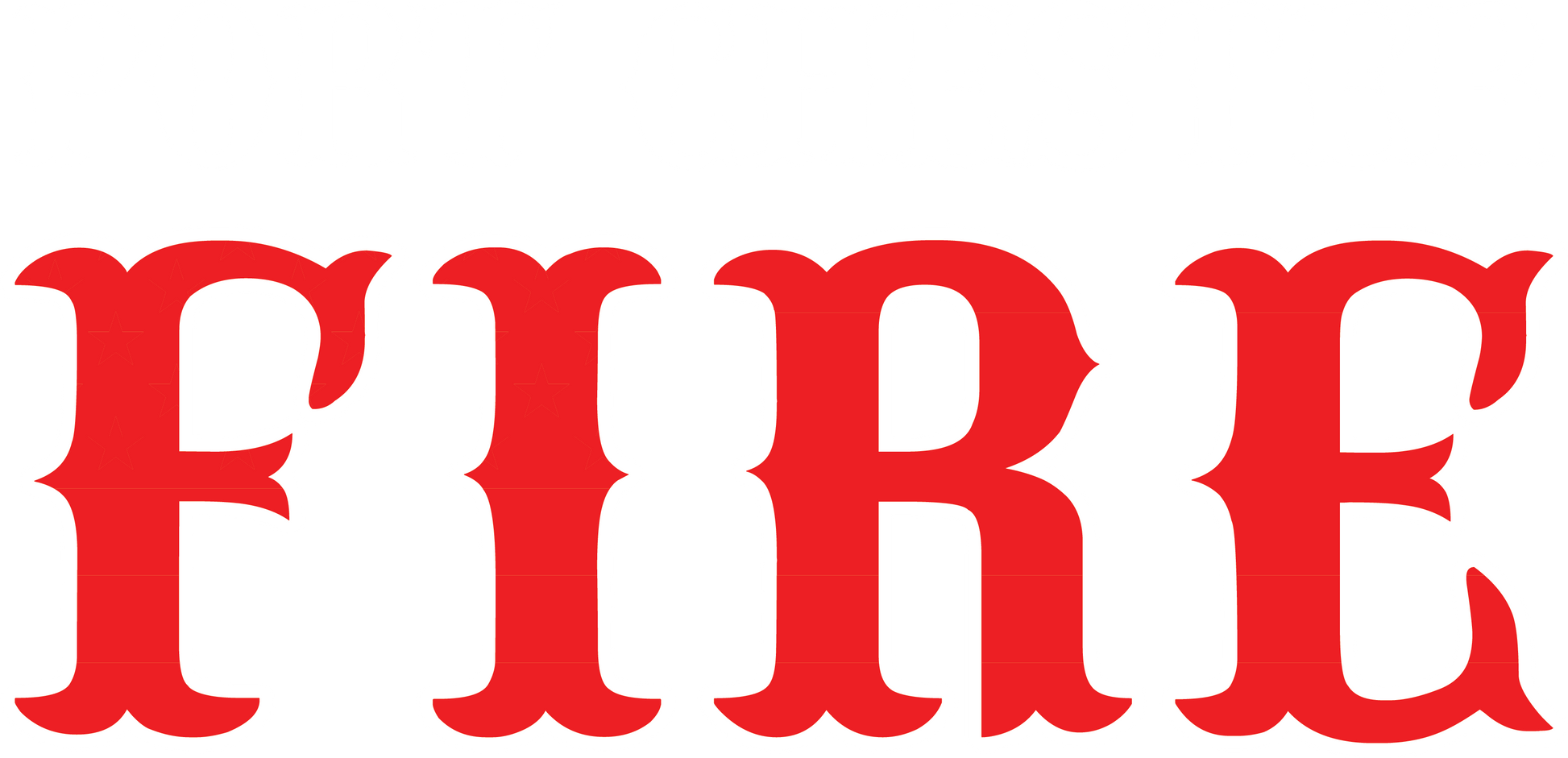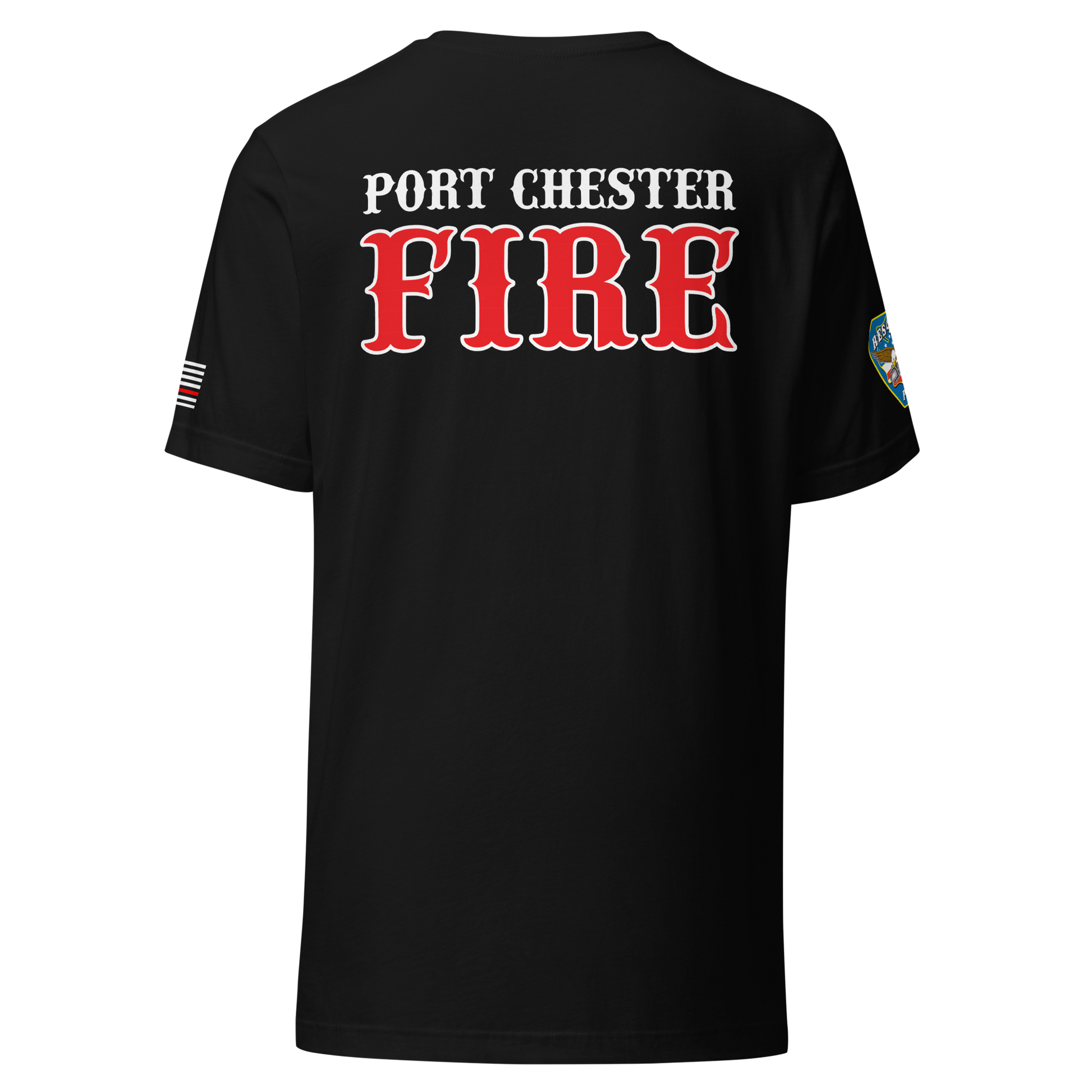 Back: PORT CHESTER in white stacked over “FIRE” in red with a white outline, displayed in the Carnivalee Freakshow–style Western font for that bold, vintage firehouse look.