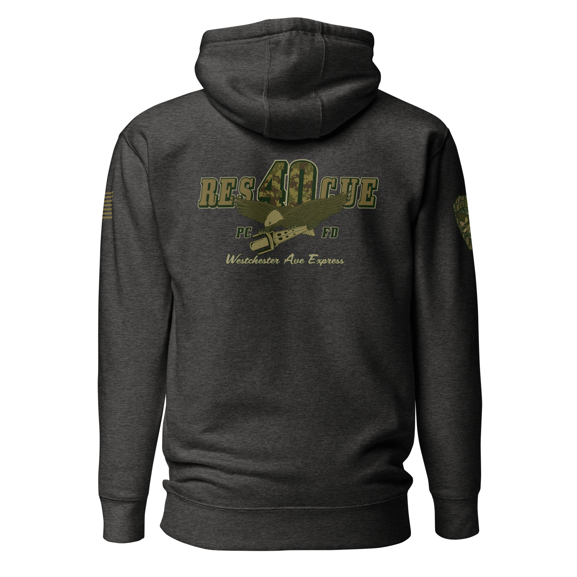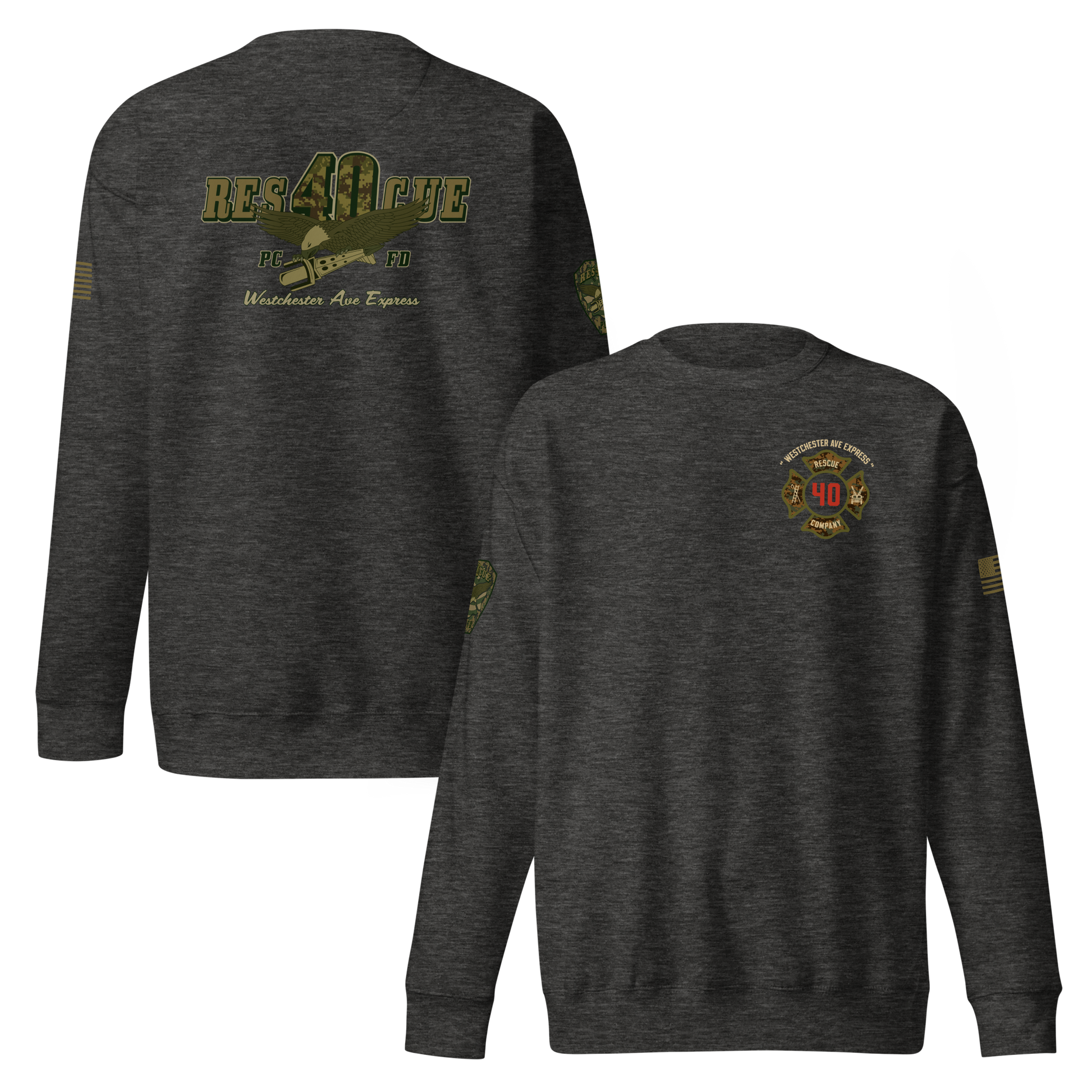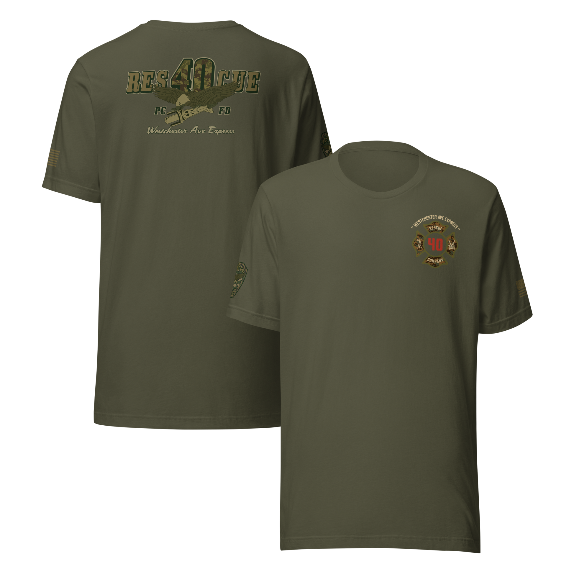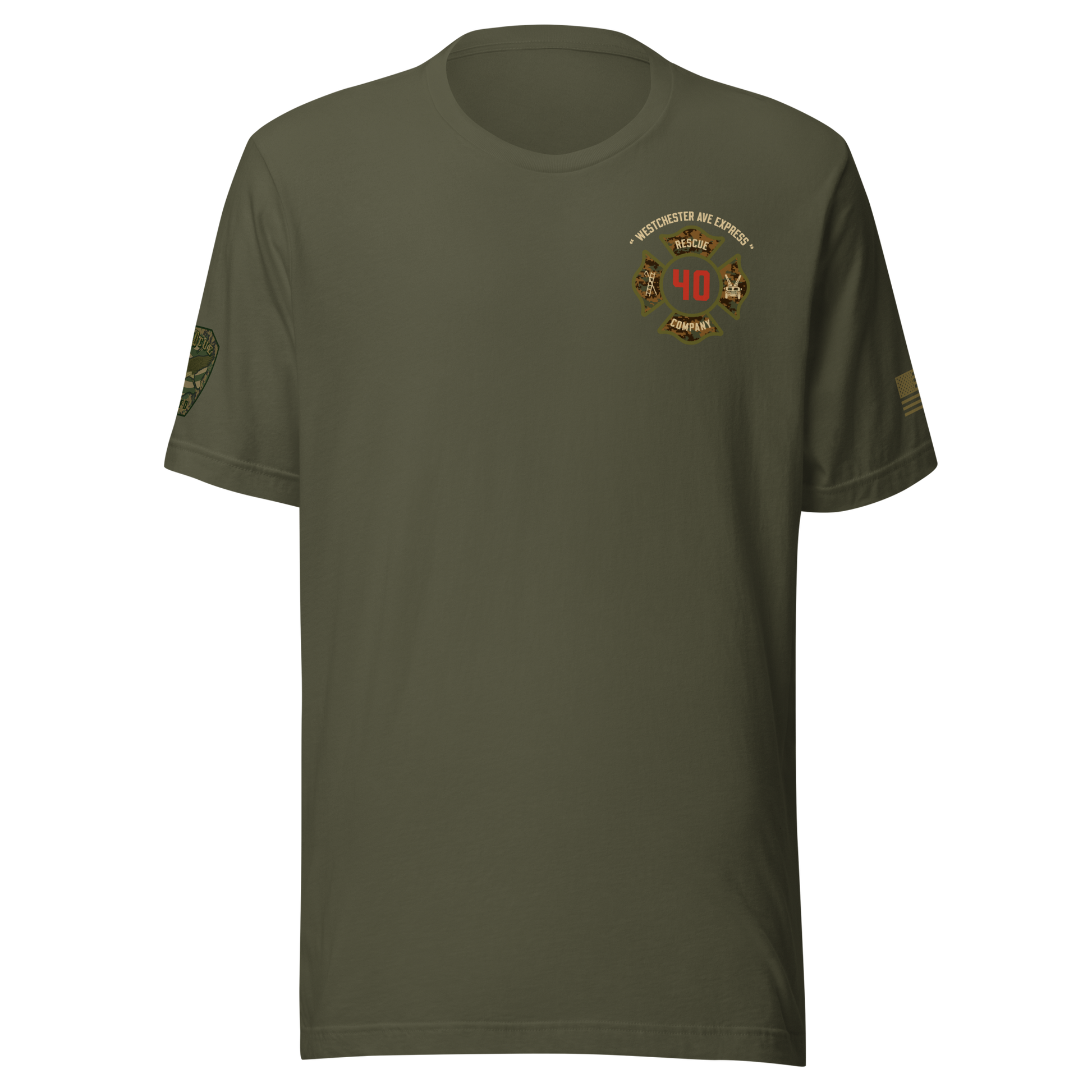 Built for durability, comfort, and pride, this collection highlights the spirit of Rescue 40 with a bold distressed-military color palette, detailed sleeve prints, and a clean chest Maltese. Every piece showcases the “Westchester Ave Express” theme and custom camouflage RES40CUE back artwork, giving it that tactical, tough, off-duty look.