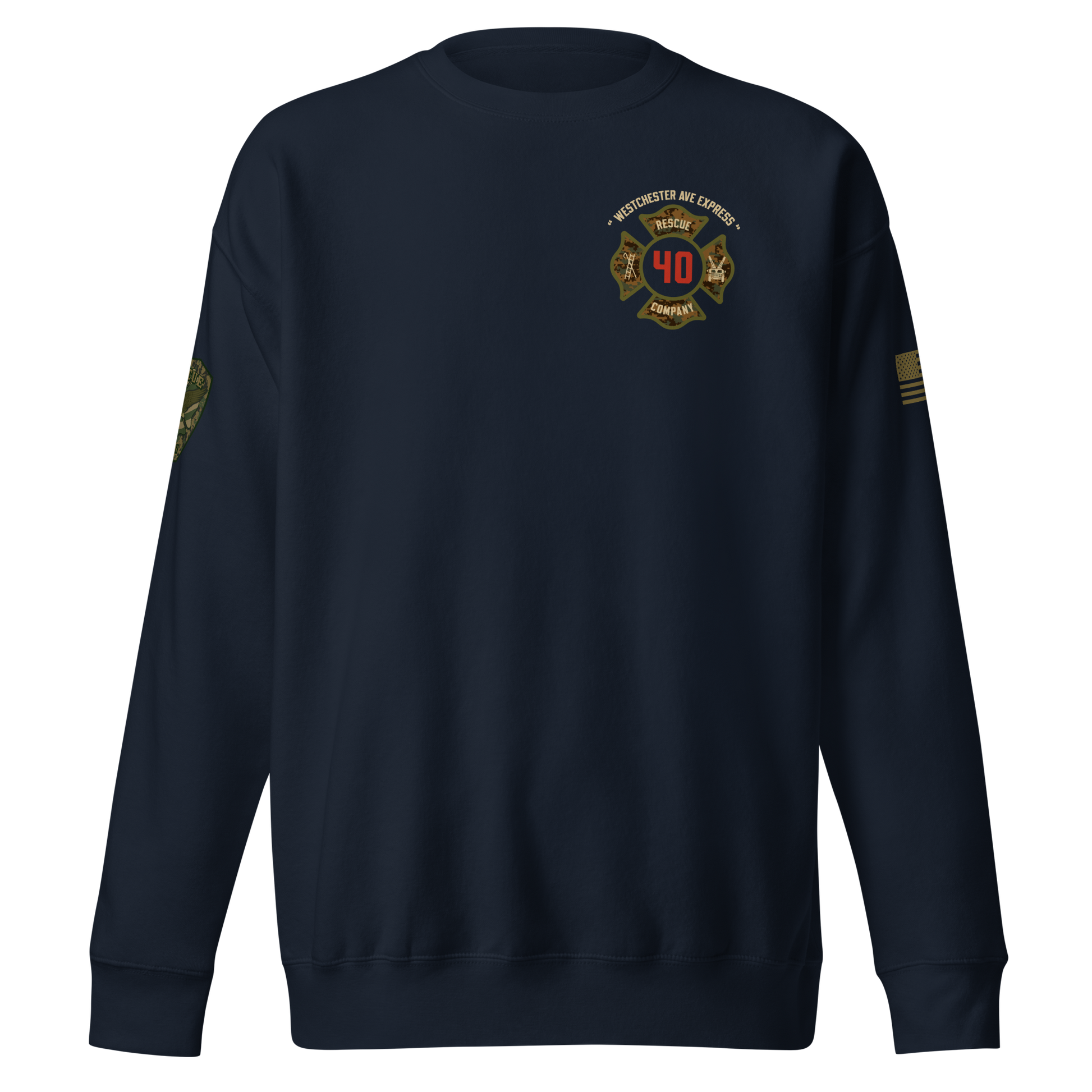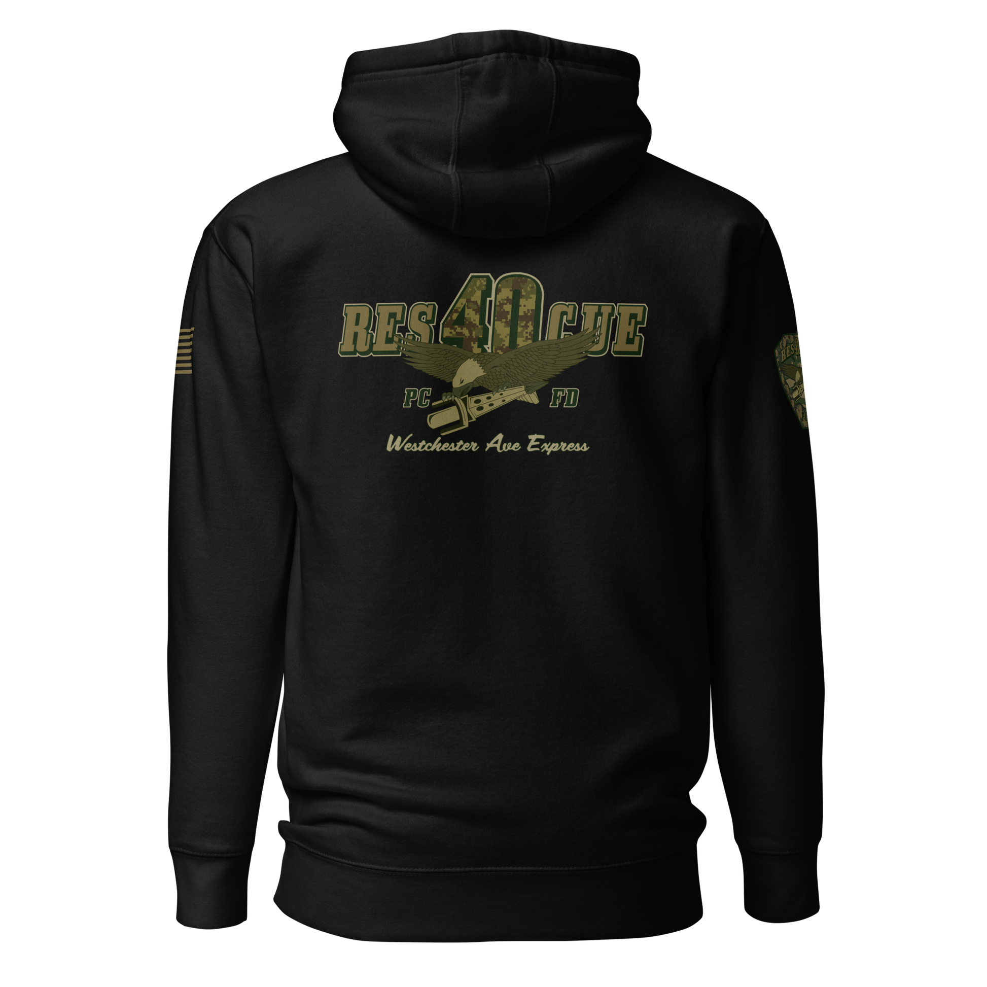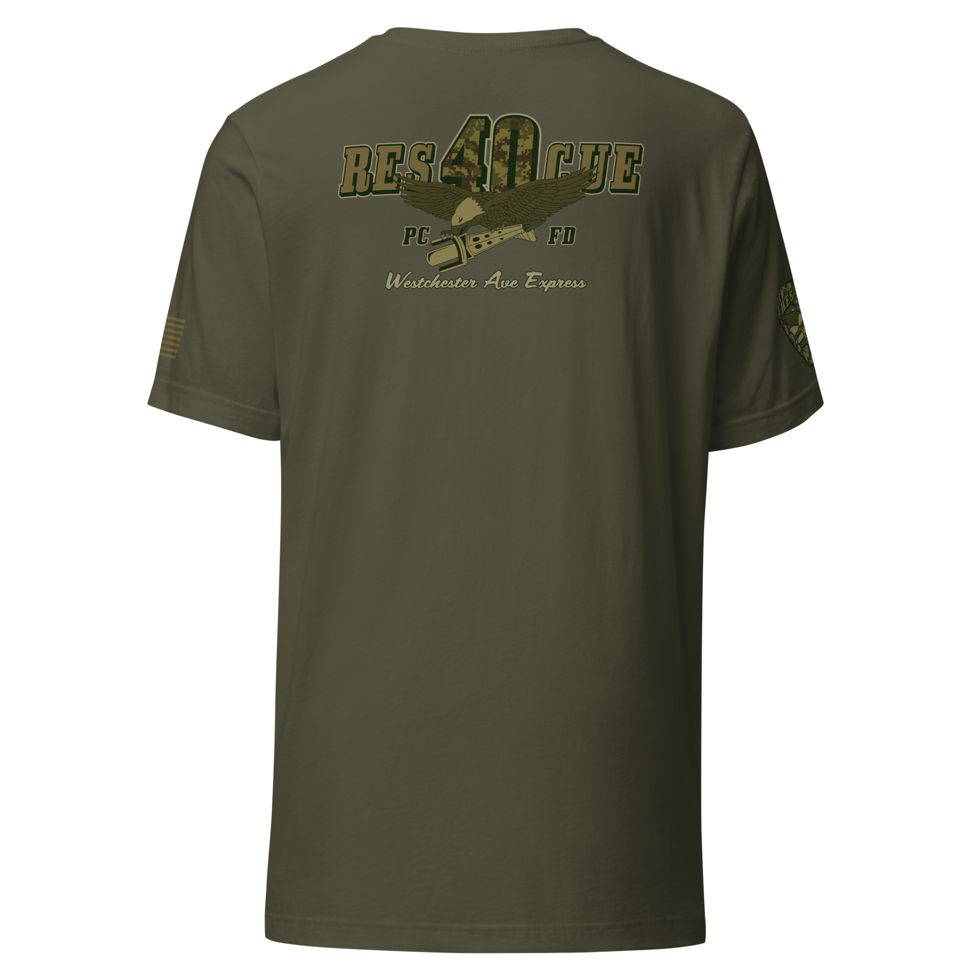 Built for durability, comfort, and pride, this collection highlights the spirit of Rescue 40 with a bold distressed-military color palette, detailed sleeve prints, and a clean chest Maltese. Every piece showcases the “Westchester Ave Express” theme and custom camouflage RES40CUE back artwork, giving it that tactical, tough, off-duty look.