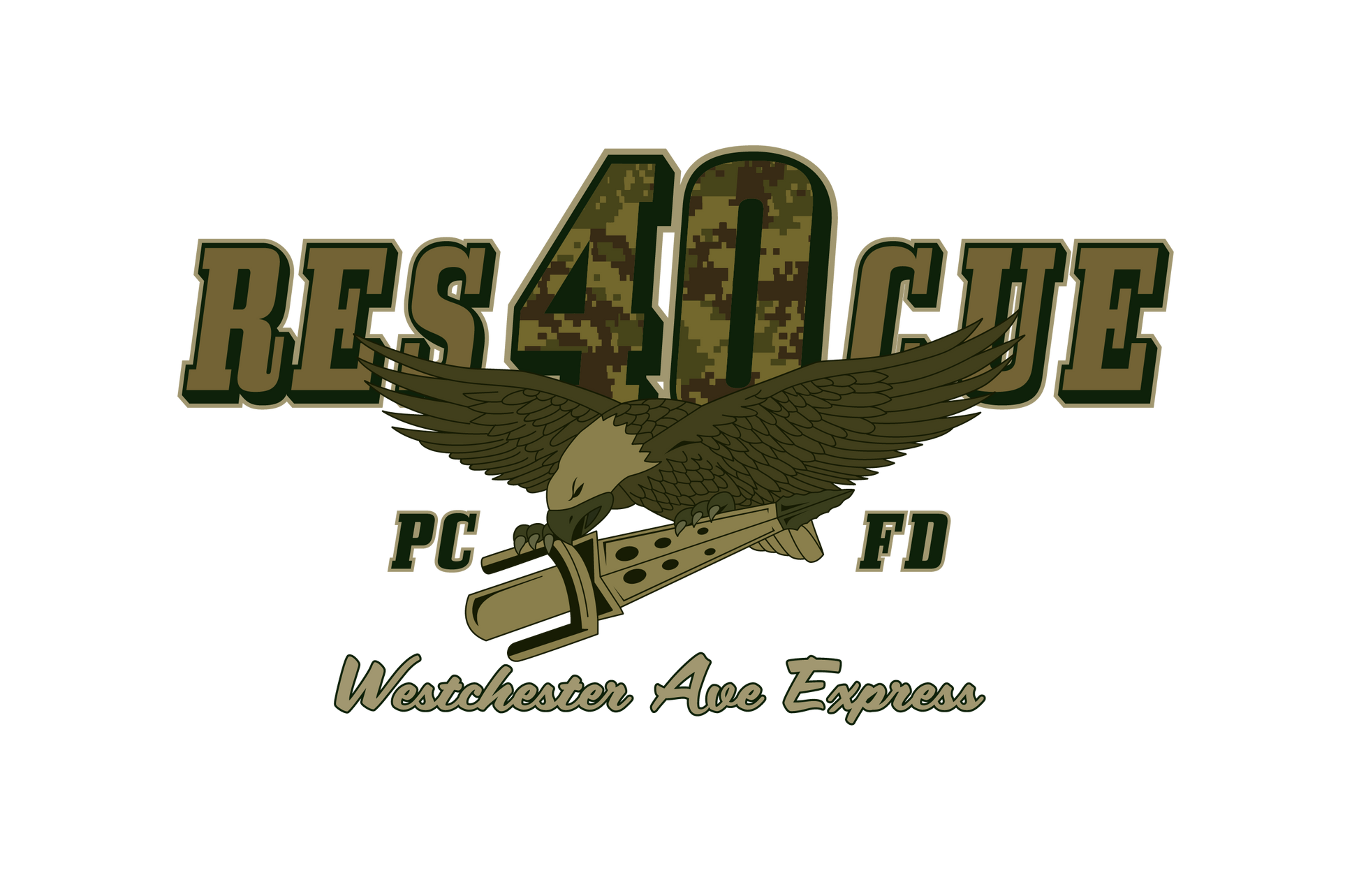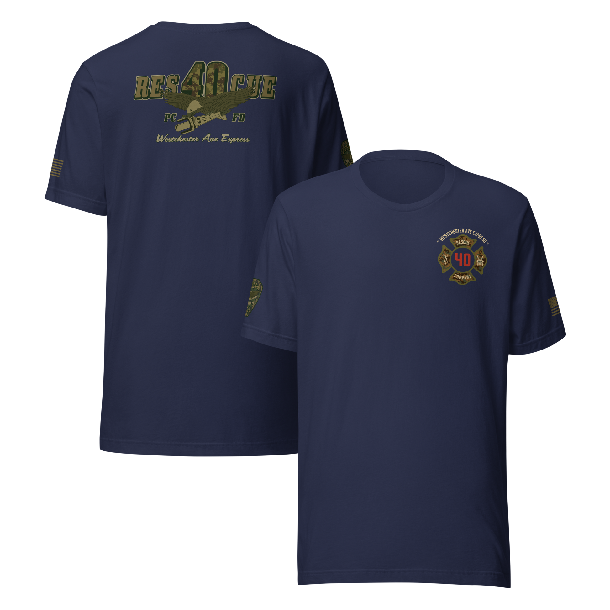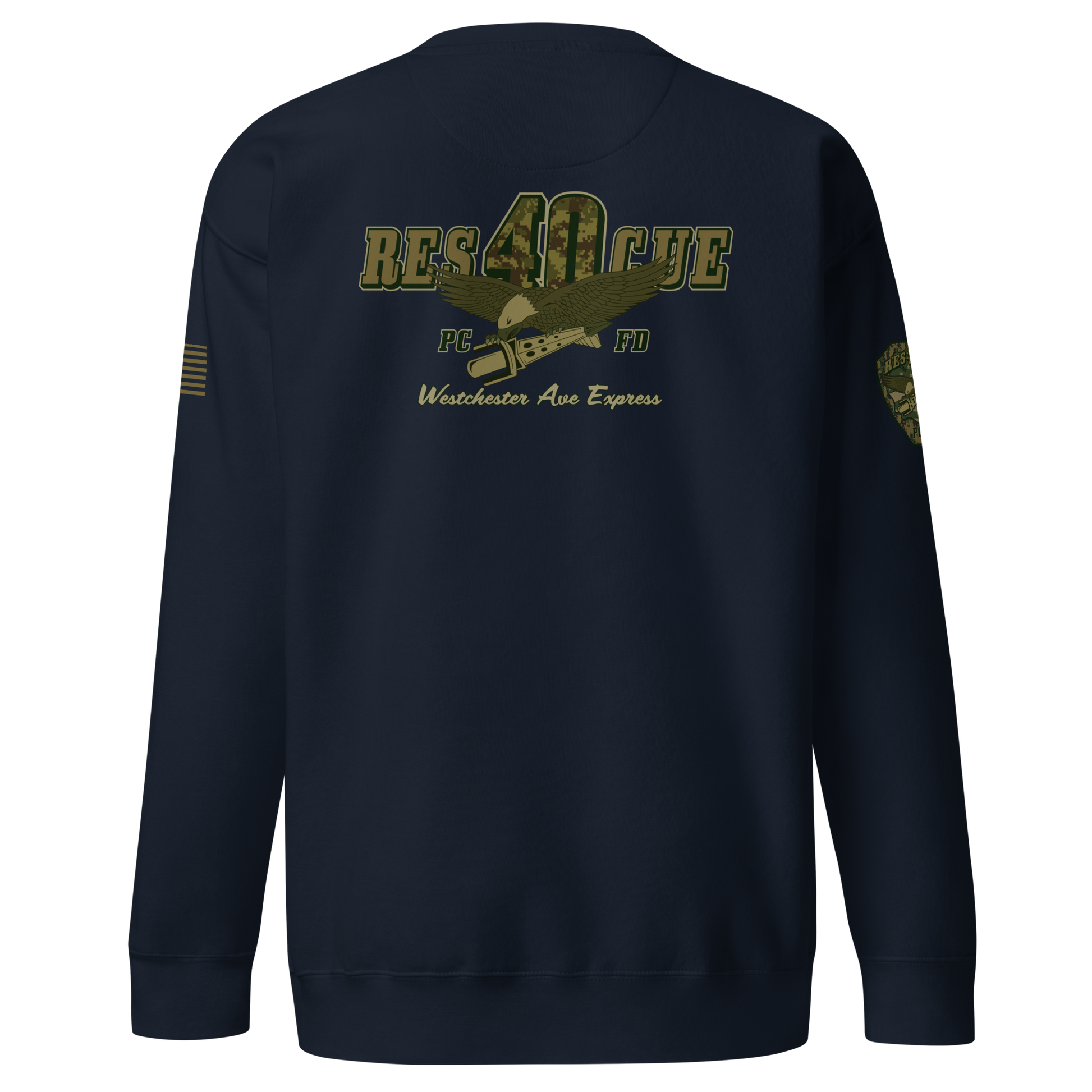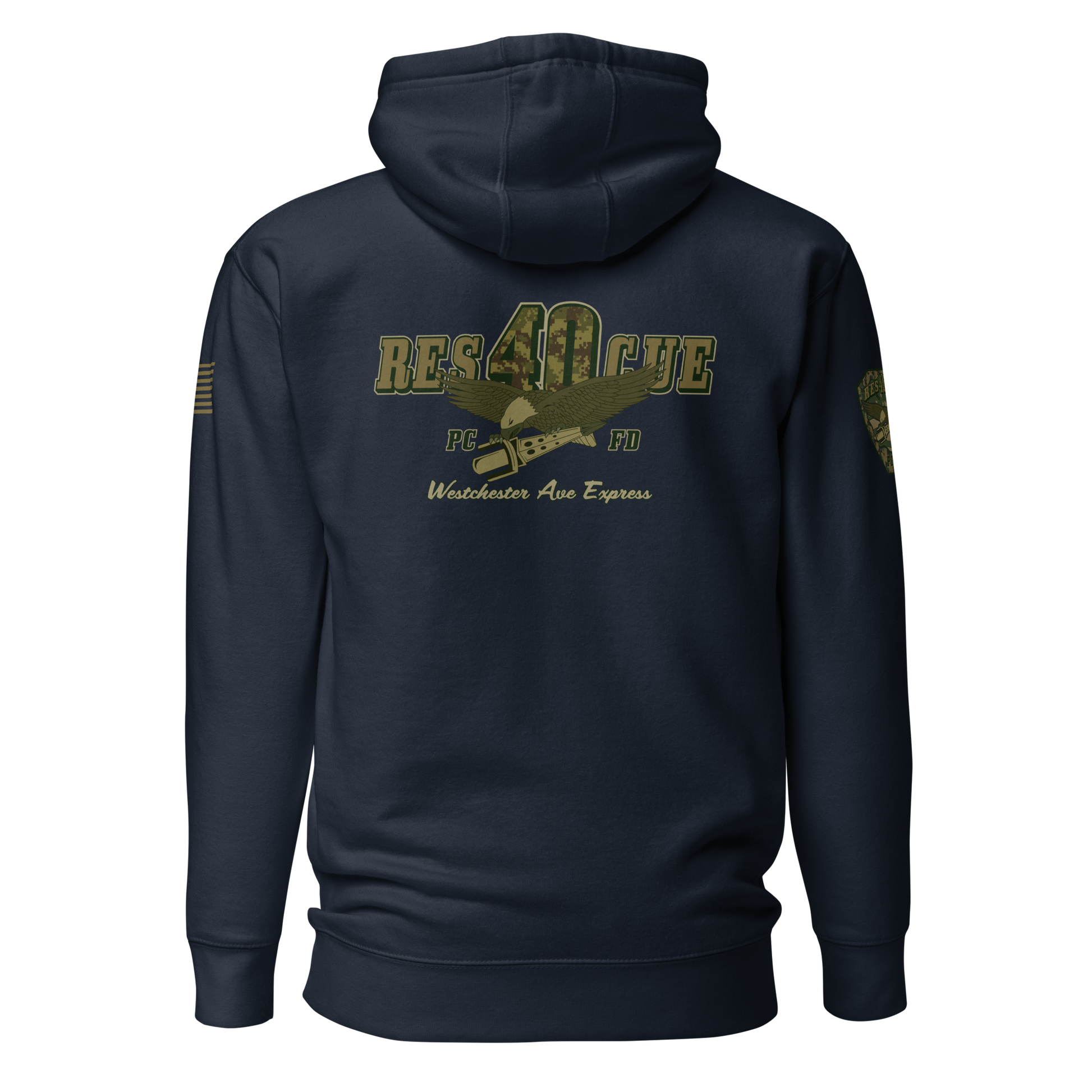 Built for durability, comfort, and pride, this collection highlights the spirit of Rescue 40 with a bold distressed-military color palette, detailed sleeve prints, and a clean chest Maltese. Every piece showcases the “Westchester Ave Express” theme and custom camouflage RES40CUE back artwork, giving it that tactical, tough, off-duty look.